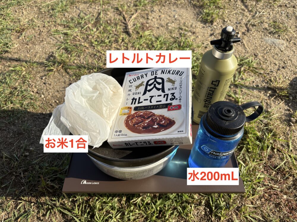 - レトルトカレー(300円くらいで購入)・・・1つ