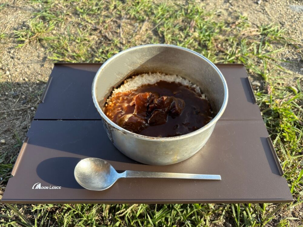 今回のソロキャンプではカレーライスにして食べました。カレーライスはルーをかけるだけなので誰でも簡単に作れます。初心者が炊飯するならカレーライスにするのがおすすめ。