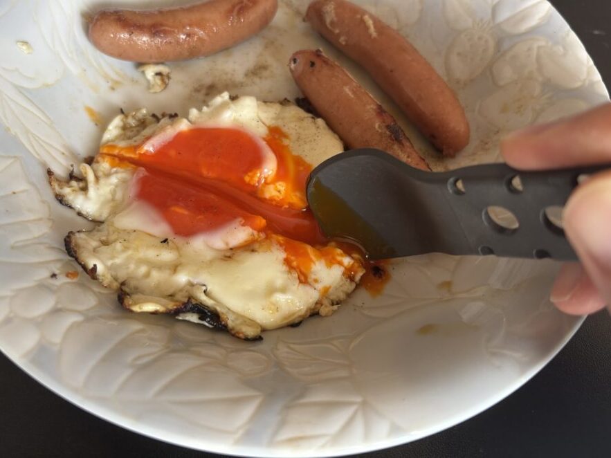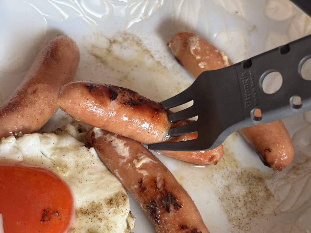 今回はこのTスプーンを使ってウィンナー(と目玉焼き)を食べてみたので、実際の使用感もお伝えします。